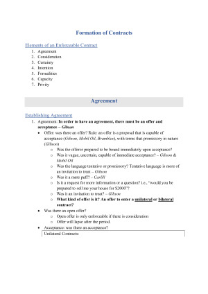 These notes include everything you need to know for the assignment and exams, including step by step guides to identifying and resolving issues in hypotheticals. Topics include: - Formation of Contract: Agreement, Consideration, Capacity, Certainty, Formality, Intention, and Privity. - Remedies in Obligations: Misleading and Deceptive conduct (ACL), Estoppel, Restitution.