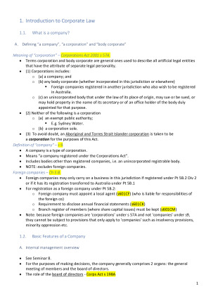These notes cover all of the topics in the UoS required for the Corporations Law final exam. I scored an HD using these notes. Topics include: - Introduction - Company Formation - Corporate Fundraising - Corporate Insolvency - Corporate Personality and Limited Liability - Corporate Constitution - Corporate Decision-Making Organs - Members' Meetings - General Law Liability in Contract and Tort - Statutory Civil Liability - Corporate Criminal Liability - Directors' and Officers' Duties - Members' Rights and Remedies