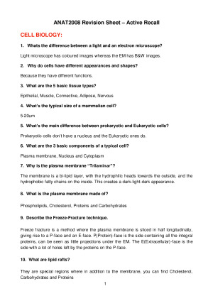These notes deliver extremely condensed information along with precisely worded, answers suitable for revision throughout the semester and for the finals. A product of weeks of study, this questionnaire utilises multiple resources to help you with "active recall", which is the proven most effective method for content memorisation and performance, and it helped me receive an 89 in this course and 92 in the final exam. The content delivered is formatted into dot points which are straightforward and contain only the necessary knowledge you require to get the mark boost you need. Categories covered in this document: . Cell biology . Epithelium . Glands . Connective Tissue . Blood Vessels . Blood . Cell Fates . Skin . Immune system . Muscle . Nervous System . Respiratory system **Note: In order to get the best benefit I would recommend consulting this revision sheet multiple times and trying to recall the answers to the best of your abilities. Good luck with your studies! :D *** The questions included in this document have not been sourced or copied from anywhere nor do they resemble final exam questions, but are simply constructed by myself after a semester long period of study to aid you with revision.