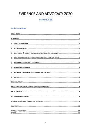 These notes are a complete comprehensive, COLOUR-CODED guide to Evidence and Advocacy, for a HD student. They include: 1. Step-by-step problem question roadmap including: - types of evidence - uses of evidence - relevance - exclusionary rules and exceptions - admissible evidence - reliabiliy - proof 2. Examination in Chief 3. Cross Examination 4. Hearsay 5. Opinion 6. Propensity/similar fact/relationship/context evidence 7. The Shield 8. Reliability (sexual offences, identification, corroboration, warnings)