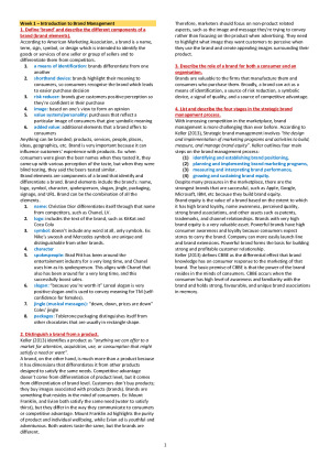 Including a 12-week lecture summary and few relevant journal articles used in the Sem 1, 2021 exam. Summary of the whole unit!! In preparation for the final exam and received an HD (88). You literally just need to study from here. Colour coordinated. Topics covered: - W1: Introduction to Brand Management - W2: CBBE and Brand Resonance - W3: Brand Positioning - W4: Brand Elements - W5: IMC and Leveraging Secondary Associations - W6: Measuring Brand Equity - W7: Brand Extensions and Branding New Products - W8: Brand Reinforcing, Revitalisasing, and Retiring Brands - W9: International Branding - W10: Brand Audits - W11: Branding Trends