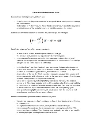 These notes cover the most challenging mastery content of the CHEM1811 course. It is detailed and supported by wide research online, and has been used to earn a high distinction mark of 92 in the final exam. List of topics covered: - Electrochemistry - Thermochemistry - Acids and Bases - Equilibrium - Intermolecular Forces Readings: Chemistry - The Central Science 3rd Edition Weeks covered: Weeks 5 - 10.