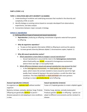 These notes include all you need to know to excel in this topic (lecture notes, workshop, and tutorial summarization). Notes are organized with learning outcomes and questions to aid in revision and exam preparation. It uses numerous tables and graphics to aid comprehension of the topic. Using these notes made it easier for me to understand information, which resulted in a higher grade (H1). Contents: Topic 1: Evolution and Life's Diversity (Lecture 1-6) Topic 2: What is the evolution (Lecture 7-12) Topic 3: Sensing and Responding to the environment (Lecture 13-18) Part (1 out of 2)