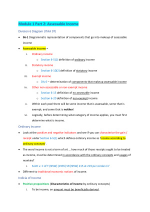 Compiled according to the classes taken by Victoria University, these notes achieved a HD mark and include summaries and assessment guides on the following modules: Module 1: Assessable Income (Part One) Module 2: Assessable Income (Part Two) Module 3: Capital Gains Tax Module 4: Deductions (Part One) Module 5: Deductions (Part Two) Module 6: Trading Stock/FBT