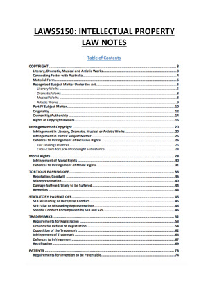 Intellectual Property Law notes used in LAWS5150 at the University of Western Australia. Course focusses on the grounds of judicial review. Comprehensive notes encompassing all required readings on the topics outlined below. Topics Covered Copyright - Copyright subsistence - Originality, ownership, authorship - Literary, dramatic, musical and artistic works - Part IV Subject Matter - Copyright infringement - Defences to infringement - Moral Rights Passing Off - Tortious passing off - Statutory passing off under the Australian Consumer Law Trademarks - Requirements for registration - Grounds for refusal of registration - Opposition of trademark - Trademark infringement - Defences to infringement - Rectification of registration Patents - Requirements for registration - Rights of patent owners - Patent infringement - Defences to infringement Topics NOT Covered - Registered designs - Intellectual property theories