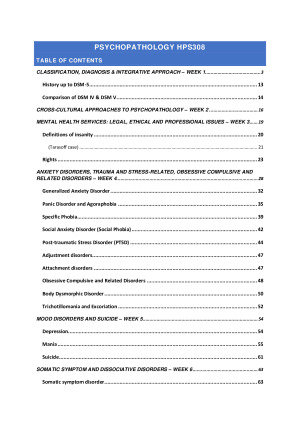 Extensive HD level Psychopathology. This is one of the largest units in psychology and having thorough notes is extremely helpful. These notes include a table of contents for easy access, comprehensive detail and summary tables based on class notes, textbook and the DSM. Topics include: 1) Classification, diagnosis & integrative approach 2) Cross-cultural Approaches 3) Legal, ethical and professional issues 4) Anxiety Disorders 5) Mood Disorders 6) Somatic Symptom Disorders 7) Substance related Disorders 8) Eating Disorders 9) Schizophrenia 10) Personality 11) Neurodevelopmental Disorders