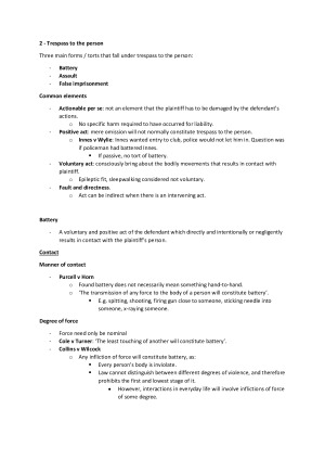 Extremely in-depth torts notes, covering all examinable topics and can also assist in completing the essay assignment. These notes are the most up-to-date (completed S2 2021). Topics include: 1. Introduction 2. Trespass to the Person 3. Defences to Trespass to the Person 4. Trespass to Land & Private Nuisance 5. Negligence - Duty of Care (General) 6. Negligence - Special Duty Situations (Pure Mental Harm & Pure Economic Loss) 7. Negligence - Breach of Duty 8. Negligence - Causation 9. Negligence - Remoteness 10. Defences to Negligence 11. Damages & Vicarious Liability