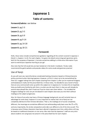 These notes include comprehensive original guidance regarding all the content covered in Japanese 1 (Genki 1, chapters 1 to 6) over the full semester. For each chapter, I’ve gone into detail concerning each grammar point, both for the purposes of Japanese 1, but also sometimes adding in a little extra information. I've also tried to be as personable as possible, and have tried to provide a genuine experience from someone who really loved the subject.