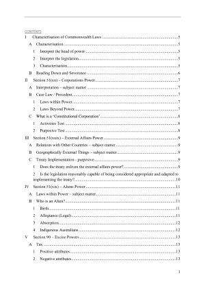 Notes comprise topics: (A) Characterisation of Commonwealth laws; (B) Heads of power including the: (i) Corporations power s 51(xx); (ii) External affairs power s 51(xxix); (iii) Aliens power s 51(xix); (C) Limitations including the: (i) Excise powers s 90 limitations on State plenary power; (ii) Intergovernmental implied immunities; (iii) Freedom of interstate trade, commerce and intercourse s 92; (iv) Section 109; and (v) Freedom of political communication and political protest. All significant case law laid out under the detailed notes for each topic. Notable cases in 2021 include, but are not limited, to: - Love v Commonwealth (aliens power and Mabo) - Clubb v Edwards (structured proportionality applying to the Freedom of political communication) - Palmer v WA (structured proportionality applying to the Freedom of interstate trade)