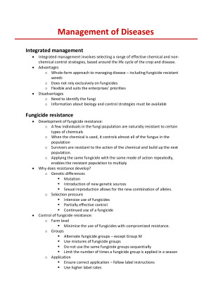 There was quite a lot of jargon and examples throughout this subject, which I have included throughout these notes in a condensed format. These notes include hand-drawn images and information about the following content; Introduction What is plant pathology? Causal agents of disease Symptoms of plant diseases Classification of plant diseases Disease triangle Post-Harvest Disease Post-Harvest Disease Overview Method of Fungi infection in fruit and vegetables Control of post-harvest disease Emerging technologies for control Food safety and Mycotoxins Paspalum Staggers in cattle Perennial Ryegrass toxicosis, or Ryegrass Staggers Bacterial post-harvest diseases Fungi Fungi Specific Definitions General characteristics of Fungi Reproduction of Fungi Phylogenetic tree of fungi The Five Phyla of fungi Summary of the groups of fungi Zygomycota Zygomycota specific terms Characteristics of Zygomycota Examples of disease caused by Zygomycota Ascomycota Ascomycota Jargon Ascomycota Characteristics Ascocarps Naked asci example – Peach leaf curl Cleistothecia (round ascocarp) example – Powdery Mildew Apothecia (Whale tail) example Perithecia (flask) Example Pseudothecia Basidomycota Basidiomycota jargon Background info on Basidiomycota Characteristics of Basidiomycota Sexual Reproduction of Basidomycota Clamp connections Plant pathogens in the phylum Basidiomycota Rusts (pucciniomycotinia) Examples of rusts Smuts (Ustilaginomycotina) Examples of Smuts Control of cereal smuts Roots and wood rots (Agaricomycotinia) Examples of Wood root Polypores Fungal Pathogen Taxonomy Importance of the correct identification of pathogens Issues affecting fungal taxonomy (identification) Type specimen Molecular taxonomy of fungal plant pathogens PCR – polymerase chain reaction – process Bioinformatics NCBI GenBank Database Phylogenetics Case study – chilli anthracnose Plant Diseases Caused by viruses Virus structure Virus detection Virus movement within host How viruses can cause disease Virus symptoms Virus transmission Insect transmission Control of viruses Properties used to distinguish viruses Virus replication strategies Single stranded RNA virus replication Virus replication (RNA Virus) – doubtful on the exam Classification of plant viruses Potyviruses Examples of plant viruses Viruses of biosecurity threat to Australia Plant Diseases caused by bacteria Introduction Bacterial taxonomy Gram stain Gram strain technique Gram +ve bacteria Gram -ve bacteria Identification of bacteria Biochemical tests Plant pathogenicity Infraspecfic groups Spread of bacteria Control Symptoms of bacterial pathogen in plants Examples of bacteria caused plant diseases Soil borne plant pathogens The soil environment Microbiomes Rhizosphere Information about soil pathogens Fungistasis Plant parasitic nematodes Nematode-Pathogen interactions Potato Early Dying syndrome Yield decline in field crops Soil borne pathogen management Soil-borne pathogens Key characteristics of soil-borne pathogens Why is it hard to control soil-borne pathogens? Control approach of soil-borne pathogens Soil disinfestation Organic amendments Biological control agents Pseudofungi Pseudofungi Overview Kingdom Protozoa Phylum Plasmodiophoromycota: Club foot of Brassica (). Phylum Plasmodiophoromycota: Powdery scab of potato (Spongospora subterranean) Kingdom Chromista – Phylum Oomycota Fishing for oomycetes – soil baiting Oomycota vs. Fungi Oomycetes as plant pathogens Phylum Oomycetes. Order Pythiales. Genus Pythium spp. Phylum Oomycetes, Order Peronosporales, Genus Phytophthora spp. Late blight of potatoes – Phytophthora infestans Phytophythora dieback of native forests in Australia (Phytophthora cinnamomic) Phylum: Oomycete. Order: Peronosporales. Name: Downy mildew Downy mildew of grape vines (Plasmopara viticola) Phylum Oomycete. Order Albuginales. White blister rust of brassica (Albugo candida) Pathogen Diversity Importance of examining pathogen diversity Factors affecting genetic diversity Mechanisms of pathogen diversity Assessing pathogen diversity Morphological markers Molecular markers Detection of pathogenic diversity Pathotype Aggressiveness Case study – diversity of Colletotrichum truncatum Case study – diversity of Colletotrichum truncatum Plant Pathogen diagnosis Plant pathogen diagnosis Means of diagnosis/identification Koch’s postulates Fungi Bacteria Viruses Diagnostic test Serological test DAS-ELISA (DAS = Double antibody sandwich) Tissue blot immunoassay (TBIA) Nucleic acid (DNA) - based diagnostic tests ELISA vs DNA techniques Quantitative PCR Case-study – Stagonosporopsis tanaceti in pyrethrum seed Biosecurity Plant biosecurity Importance of biosecurity Biosecurity in Australia Surveillance Import Risk Analyses Compliance and certification Emergency Plant Pests (EPPs) EPP incident response Domestic Quarantine Case study – Khapra beetle Case study – Potato Cyst Nematode Case study – Grape Phylloxera Authorised inspectors Genetics of plant resistance Types of resistance Breeding for disease resistance Gene for gene hypothesis Race-specific/ Vertical resistance Race non-specific / horizontal resistance Comparison of race-specific vs non-specific Horizontal and Vertical resistance Potential for pathogen to overcome resistance Infection and pathogenesis Definitions: Life cycle and disease cycle Stages in a disease cycle Classes of infectious fungi Infection phases of Colletotrichum spp. Endophytic infection Host-pathogen interactions Host-pathogen relationship Complex interaction between pathogen and host Pathogen invasion Identification of specific genes involved in infection process – example Toxins produced by the pathogen Host response Host defence Antimicrobial substances – induced Resistance mechanisms Management of diseases Integrated management Fungicide resistance Application of fungicides – methods Integrated management and the disease triangle Integrated Management of Barley Powdery Mildew (Blumeria g