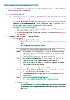 These are comprehensive, color coded notes for all content examinable in the final exam (weeks 7 - 12). All relevant cases and statutes are included. Important takeaway from the cases & ratio decidendi all highlighted. It is a helpful summary of all readings set for the course, definitely memorizable for the final exam. The notes are formated to be a step-by-step structure for how to answer a problem question. The discussion of most week's seminar problems are also included in this comprehensive structure. Topics include Inconsistency between federal and state laws, Executive power, Intergovernmental immunities, Freedom of interstate trade, commerce and intercourse, Freedom of religion, amd Implied freedom of political communication. The structure is set out very clearly and I have received feedback that the notes are extremely helpful for exam preparation!