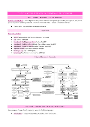 Completed study notes with included case summaries for all required cases and sections of applicable statutes (as of semester 2, 2020) from weeks 1-13 for Criminal Law I (LAWS2701). Colour co-ordinated for easy learning and to break up core topics. Topics Include: 1. Core Themes in Criminal Procedure 2. Police Powers - Arrest and Search 3. Interrogation and Admissibility of Evidence 4. Pre-Trial Process - Bail, Committals, Disclosure and Pre-Trial Hearing 5. Pre-Trial Process - Indictments, Pleas and Double Jeopardy 6. Court Proceedings, Trial and Jury 7. Fair Trial and Abuse of Process 8. Sentencing 9. Punishment and Penalties 10. Appeals 11. Appeals and the Proviso 12. Legal Representation