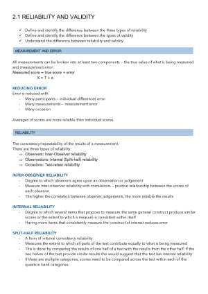 These are the notes I used to study for the final exam, on which I scored 92%. They cover every bit of content of all the lectures from weeks 1-10, including: RESEARCH METHODS - Thinking like a Scientist - The Scientific Method - Reliability and Validity - Threats to validity - Descriptive and Observational Research - Correlational Research - Quasi-Experiments - True Experiments - Ethics STATISTICS - Introduction - Measuring and Manipulating Variables - Measures of Central Tendency - Measures of Variability - Percentile Rank and z-score - Tables - Frequency Distribution Graphs - Stem-and-Leaf Plots - Scatterplots - Z-score and Standard Normal Distribution - Distribution of Sample Means - Inferential Statistics 1,2,3,4,5,6 - Single sample t-test - Independent sample t-test - Relationship in nonparametric data: Introduction to Chi-square (1,2)