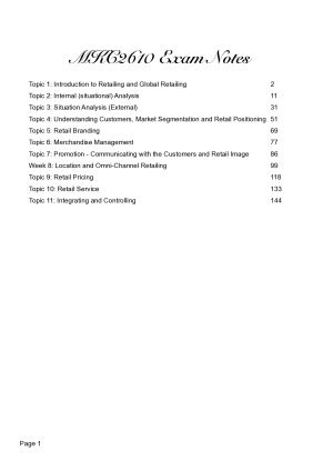 A comprehensive and detailed set of HD notes that explains all content from the textbook and lectures with additional examples and diagrams. These exam-ready notes are formatted through headings and sub-headings that make the notes very easy to follow and understand. Topic List: Topic 1: Introduction to Retailing and Global Retailing 2 Topic 2: Internal (situational) Analysis 11 Topic 3: Situation Analysis (External) 31 Topic 4: Understanding Customers, Market Segmentation and Retail Positioning 51 Topic 5: Retail Branding 69 Topic 6: Merchandise Management 77 Topic 7: Promotion - Communicating with the Customers and Retail Image 86 Week 8: Location and Omni-Channel Retailing 99 Topic 9: Retail Pricing 118 Topic 10: Retail Service 133 Topic 11: Integrating and Controlling 144