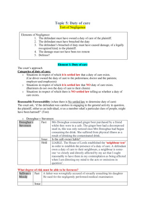 A solid, up-to-date, HD lecture note on LAW1113 Torts. This note cover all essential elements on the topic of negligence including: -duty of care -PEL/PML -breach of duty -causation -remoteness -defence Each key elements has been well analysed and support by the case summaries. PS: Every case stated the "Fact" "Issue" and "Held''sections which can be very helpful for the citations during the final exam. This can save your time for research!