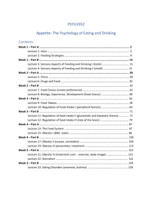 Hi!! Thank you for checking out my notes! This unit was extremely interesting and my notes reflect that. I've condensed the information into a simple format with pictures - making it easy to study for assignments and exams. I've also taken the time to write down extra notes that helped me remember content. I received a distinction for this unit. Because I completed this unit in session 3, the content layout might be a bit different to how in-session will be, but all of the content will be the same. The table of contents is as follows: Week 1 – Part A - Lecture 1: Intro - Lecture 2: Feeding Strategies Week 1 – Part B - Lecture 3: Sensory Aspects of Feeding and Drinking I (taste) - Lecture 4: Sensory Aspects of Feeding and Drinking II (smell) Week 2 – Part A - Lecture 5: Thirst - Lecture 6: Drugs and Food Week 2 – Part B - Lecture 7: Food Choice (innate preferences) - Lecture 8: Biology, Experience, Development (food choice) Week 3 – Part A - Lecture 9: Food Taboos - Lecture 10: Regulation of Food Intake I (peripheral factors) Week 3 – Part B - Lecture 11: Regulation of food intake II (glucostatic and lipostatic theory) - Lecture 12: Regulation of food intake III (role of the brain) Week 4 – Part A - Lecture 13: The Food System - Lecture 15: Obesity I (BMI, stats) Week 4 – Part B - Lecture 17: Obesity II (causes, correlates) - Lecture 19: Obesity III (prevention, treatment Week 5 – Part A - Lecture 21: Obesity IV (treatment cont. - exercise, body image) - Lecture 22: Starvation Week 5 – Part B - Lecture 23: Eating Disorders (anorexia, bulimia)