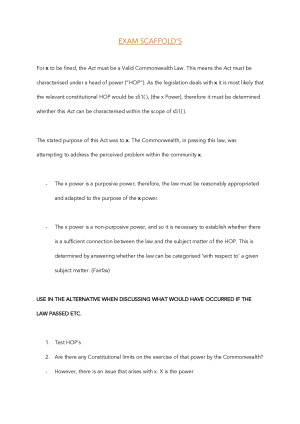 These notes helped me get an HD - Largely as a result of the exam scaffolds allowing me to come into the final exam with responses prepared. These notes are derived from not only the lecture and textbook but also a range of other sources provided to us by the subject coordinators. THE SAMPLE NOTES IS ONE EXAMPLE OF MY EXAM SCAFFOLD'S I THOUGHT THIS WOULD BE THE BEST WAY TO SHOWCASE MY NOTES These notes consist of the following topics JUDICIAL POWER Implied Freedom of Political Communication FEDERALISM EXTERNAL AFFAIRS — s 51(xxix) NATIONALISM AND ALIENS POWER (51xix) DEFENCE POWER ACQUISITION OF PROPERTY ON JUST TERMS INCONSISTENCY BETWEEN CTH AND STATE LAWS Trial by Jury Freedom of Religion: