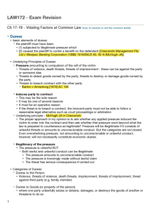 Covers examinable topics for T3, 2020 exam: Vitiating Factors at Common Law; Vitiating Factors at Statute; Ending the Contract - Discharge / Termination; Remedies.