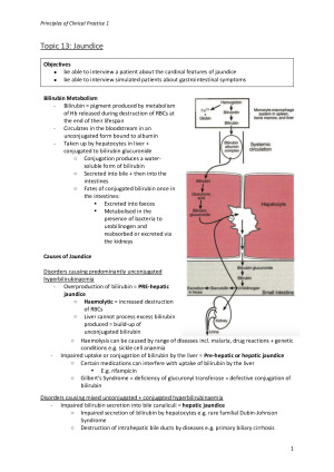 Includes notes for History Taking, with background information on the presenting complaint and detailed notes on the cardinal features. Extra summary page for each presenting complaint, summarising the history. Topics covered in Semester 1: 1. Effective communication 2. Pain as a presenting problem 3. Chest and leg pain 4. Transient loss of consciousness 5. Oedema and dyspnoea 6. Medication history 7. Asthma and social/occupational history 8. Smoking, alcohol and drugs 9. Cough and haemoptysis 10. Abdominal pain 11. Vomiting and dysphagia 12. Bowel habit and rectal bleeding 13. Jaundice Received a H1 studying from these notes.