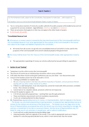 DETAILED, EXTENSIVE AND WELL STRUCTURED FEDERAL CONSTITUTION LAW NOTES RECEIVING A HD MARK. Note: Topics 1-2 were examinable in Mid-semester Exam Topics 3-10 were examinable in Final Exam Part I: Full Course Notes with complete case summaries and with key principles (sample pages 1-3) highlighted and colour coded. These notes have been made through spending many hours to compile different sets of notes from HD students in conjunction with the assigned textbook, optional reading and tutorial work. Topics include: Topic 1: Interpretation & Trade + Commerce Topic 2: Inconsistency Topic 3: External Affairs Topic 4: Corporations Power Topic 5 – Section 92: Freedom of Interstate Trade – Constitutional prohibition Topic 6: Taxation Topic 7: Lecture Grants Topic 8 – Defence And The Communist Party Case – Purposive Power Topic 9: Implied Freedom of Political Communication Topic 10: Intergovernmental Immunities Part II: Problem Question Scaffolds (sample pages 3-17) Includes a comprehensive scaffold of each topic which is essential for answering problem questions during the final exam as it ensures that all essential elements of the question are addressed. This scaffold also helped me understand how the individual topics are linked together and was the key to my high distinction mark.