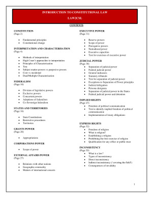 Save a bunch of time with these up-to-date constitutional law notes. Perfect for end of year exam and revision. Areas covered: CONSTITUTION • Fundamental principles • Constitutional change INTERPRETATION AND CHARACTERISATION • Methods of interpretation • High Court’s approaches to interpretation • Principles of Characterisation • Test • Subject matter powers vs purposive powers • Core vs incidental • Dual/Multiple Characterisation FEDERALISM • Division of legislative powers • Exclusive powers • Concurrent powers • Adoptions of federalism • Co-Sovereign federalism STATES AND TERRITORIES • State Constitutions • Restrictive procedures • Territories GRANTS POWER • Appropriations CORPORATIONS POWER • Scope of power EXTERNAL AFFAIRS POWER • Relations with other nations • Geographic externality • Matters of international concern EXECUTIVE POWER • Reserve powers • Scope of power • Prerogative powers • Nationhood power • Executive capacities • Test for exercises of executive power JUDICIAL POWER • Separation of judicial power • Federal judicial power • General indicators • Statutory tribunals • Test for separation of judicial power • Exceptions to Separation of Power principles • Judicial delegation • Persona designata • Separation of judicial power in the States • Federal judicial power and detention IMPLIED RIGHTS • Freedom of political communication • Test to identify implied freedom of political communication • Implementation of treaty obligations EXPRESS RIGHTS • Freedom of religion • What is religion? • Establishing a religion • Prohibiting the free exercise of religion • Qualification for any office or public trust INCONSISTENCY • What is a law? • Types of inconsistency • Direct inconsistency • Indirect inconsistency (‘covering the field’) • Consequences of invalidity