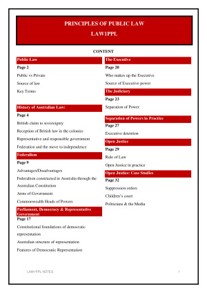 Full notes for LAW1PPL, great for revision and for exam. CONTENT: Public Law: Public vs Private Source of law Key Terms History of Australian Law: British claim to sovereignty Reception of British law in the colonies Representative and responsible government Federation and the move to independence Federalism: Advantages/Disadvantages Federalism constructed in Australia through the Australian Constitution Arms of Government Commonwealth Heads of Powers Parliament, Democracy & Representative Government: Constitutional foundations of democratic representation Australian structure of representation Features of Democratic Representation The Executive: Who makes up the Executive Source of Executive power The Judiciary: Separation of Power Separation of Powers in Practice Page 27 Executive detention Open Justice: Rule of Law Open Justice in practice Open Justice - Case Studies: Suppression orders Children’s court Politicians & the Media