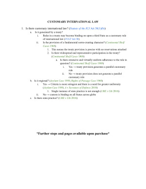 Clear, easy to understand scaffolds which provide a clear step-by-step process for solving all types of problem questions with appropriate authorities. These notes have been written by a student who has composed SULS subject guides for PIL and hence, they have been structured in a way that optimises study time and fosters a comprehensive understanding of the course work. Topics: 1. Nature and Scope of Public International Law 2. Sources of Public International Law 3. Treaties 4. International Law and Domestic Law 5. International Legal Personality, Statehood and Self-Determination 6. State Title to Territory 7. State Jurisdiction 8. Immunity from Jurisdiction I 9. Immunity from Jurisdiction II 10. State Responsibility I 11. State Responsibility II 12. Use of Force 13. Implementation, Enforcement, Accountability