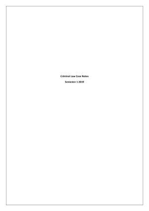 Case notes detailing major and supporting cases for Adelaide University Criminal Law course. Topics: - Homicide Offences (murder, manslaughter) - Offences against the person (case involving children, level of force, causing fear or apprehension of harm, boundaries of consent) - Sexual Offences (issue of consent, defining sexual intercourse, deception as to age, line between USI and rape, procuring a child to commit an indecent act, relevance of complainants intoxication, sexual harassment online) - Dishonesty Offences (immediacy, force, dishonesty) - Attempts - Mental Impairment