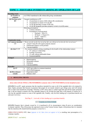 A semester's worth of content summarised into a step-by-step structure. I completed Property B in 2020 and received a HD for the unit and the exam with the help of these notes. Topics: 1. Equitable interests arising by operation of law 2. Co-ownership 3. Mortgages 4. Intro to enforceability of property disputes & TS 5. Principles of indefeasibility of title 6. Exception to indefeasibility 7. Unregistered interests under TS