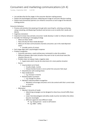These notes are a comprehensive bible to get you through MKTG3112 Marketing Communications. They contain all essential theory. Introduction to marketing communications Consumers and marketing communications Planning for marketing communications Creative strategy Communication process Media strategy and broadcast, print Support media, direct marketing Sales promotion, public relations, corporate advertising Digital marketing International marketing communications Evaluation
