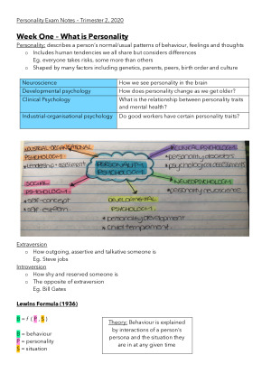 HPS307 - Personality notes notes - collated from study guides, lectures and tutorials from week 1-11 - comprehensive and detailed notes from all parts of the unit - easy to read format colour utilised to assist with learning Includes topics from: Topic 1 - What is Personality? Topic 2 - Dominant Theories: Biological or Trait Topic 3 - Dominant Theories: Social Learning & Self Concept Topic 4 - Dominant Theories: Psychodynamic & Motivation Topic 5 - Testing & Measuring Topic 6 - Personality Across the Lifespan Topic 7 - Personality, Health & Wellbeing Topic 8 - Personality, Disorders & Therapeutic Approaches Topic 9 - Personality & Cognition Topic 10 - Personality in the Workplace Topic 11 - Personality & Culture