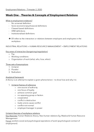 MMH349 - Employment Relations notes - collated from study guides, lectures and tutorials from week 1-10 - comprehensive and detailed notes from all parts of the unit - easy to read format colour utilised to assist with learning Includes topics from: Topic 1 - Theories & Concepts of Employment Relations Topic 2 - Trade Unions & Employer Associations Topic 3 - The Employment Contract Topic 4 - The Legal Framework Topic 5 - Federal and Industrial Relations Topic 6 - Agreement Making Topic 7 - Wage Determination Topic 8 - Workplace Diversity Laws Topic 9 - Workplace Health and Safety Topic 10 - Integrating Human Resource Management and Industrial Relations