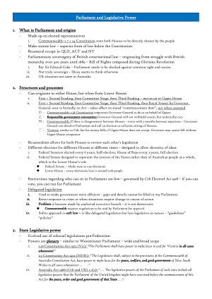 Full run down of Australian Public Law structures. Also a comprehensive table on how to do Statutory interpretation! The topic list for the notes is: - Rule of law - Relationships between Australia's different legal structures and concepts - History of Australian Public Law - Legislative power (state + federal) - Executive power (state + federal) - Judicial power (focus on Chapter III courts) - Executive detention (Al-Kateb, ALJ20, Plaintiff M68, Chu Kheng Lim, Singh) - Statutory Interpretation method table - Cases for application of statutory interpretation issues Have fun