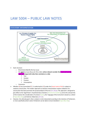Notes for Public Law Exam (taken in T3 JD 2022) Covers content from weeks 9-10-11 (Statutory Interpretation) and human rights (exam essay topic) Used these notes to guide the process for statutory interpretation and develop arguments for the human rights final exam essay