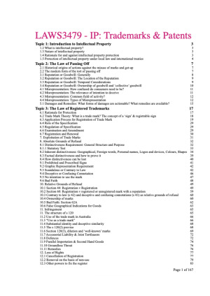 BENEFITS OF MY NOTES - These notes provide you with order and structure in how you approach problem questions. - I have provided PINPOINTS as well having completed the readings and this will give you bonus marks in achieving that HD. - These notes cover all aspects of the course - Covers all the facts, principles and decisions LEGEND - Light Blue = Key principles - Pink = Case Names - Dark Blue = Legislation - Red / Bold = Anything Key to Note TOPICS - Introduction - Passing Off - Trademarks - Patents It covers all subtopics covered in the course for these topics