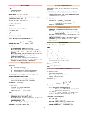 Thank you for viewing my notes! This unit is quite a difficult one, so I hope my cheat sheet can help you with highlighting and clarifying the most important information in the unit. I did very well in this subject, getting 92 overall in the unit. I am a top performing student (within the top 1% of my cohort) and have a WAM of 90. I partly did so well in this unit as I was able to bring this cheat sheet into our open book exam, which proved to be extremely useful! I hope you find my notes useful :) This cheat sheet includes: - Basic calculations - Regression theory - Regression with numeric predictors - Interaction interpretations - Curvilinear models - Chi-square and logistic regression - Between-subjects designs - Within-subjects designs - Effect sizes - Outliers - Model reduction - Familywise and testwise error - A list of important Stata commands - Degrees of freedom - Miscellaneous theory