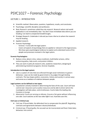 PSYC1027 Forensic Psychology Mark: HD - 96 Includes lecture notes and notes on extra accessible resources. Includes notes from week 1 to 10 Topics covered include: Introduction, offence, courts, pre-trial, conviction, sentencing, punishment, ethics, assessment and treatment.