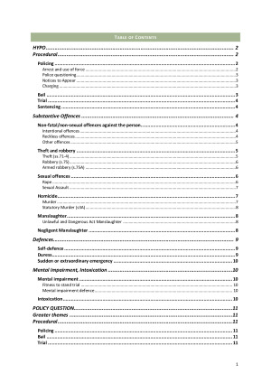 These H1 notes provide checklists for all the procedural and substantive offences taught in the subject. Notes for policy questions are also included. These notes are concise and very well organised. They can be used as a roadmap to ensure all relevant cases and provisions are accounted for in your answer. Topics covered: - Policing - Bail - Trial - Sentencing - Non-fatal/non-sexual offences against the person - Theft and robbery - Sexual offences - Homicide - Manslaughter - Negligent Manslaughter - Defences - Mental impairment - Intoxication - Policy questions