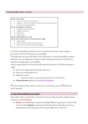 Structured in a step-by step format to assist with exam prep and includes intro sentences and statements of law for each topic 1. State Legislative Powers 2. External Affairs Powers s 51(29) 3. Federal Executive Power + Spending Power 4. Separation of Federal Judicial Power 5. Institutional Integrity of Courts 6. s 109 Inconsistency 7. Intergovernmental Immunities 8. Implied Freedom of Political Communication