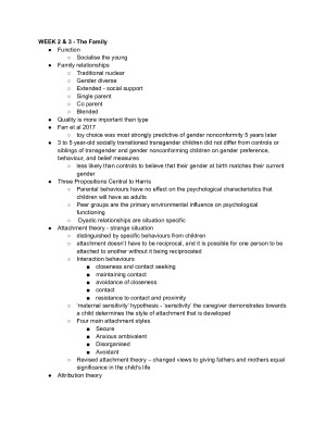 Complete lecture notes from weeks 2-12 Topics: The family Neurobiological issues Child abuse and neglect Child sexual abuse Emotion regulation Peers Aggression and bllying Moral Development and Criminal Responsibility Prosocial Development Gender development