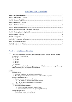 ACCT2331 Final Exam Notes 1 Week 1 - Intro to Aus. Taxation 1 Week 2 - Income Tax (Ch8) 5 Week 3 - Residence & Source 13 Week 4 - Ordinary Income 19 Week 5 - General Deductions 25 Week 6 - Statutory, Exempt, Deductions, Provisions 31 Week 7 - Trading Stock & Capital Allowances 42 Week 8 - Capital Gains Tax 46 Week 9 – Companies 52 Week 10 - Partnerships & Trusts 58 Week 11 - Fringe Benefits Tax 64 Week 12 - Income Tax Return 70