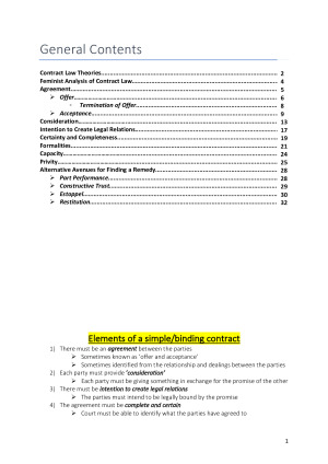This document includes every week's lectures (from week 1-13) plus additional notes and information for exams. This document has the best notes possible for the exam. Topics covered in relation to contract law: - Agreement in contracts - Offer - Acceptance - Consideration - Intention to create legal relations - Certainty - Completeness - Formalities - Capacity - Privity - Alternative Avenues for finding a remedy: (part performance, contractive trust, estoppel, restitution.