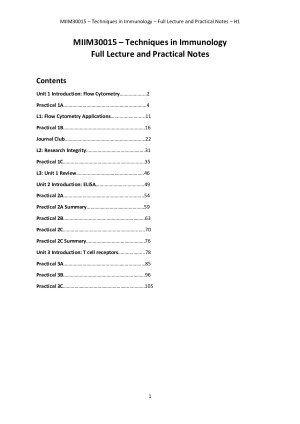 MIIM30015 - Techniques in Immunology - Full Lecture and Practical Notes - H1 Includes lecture notes, journal club notes, unit introductions and scientific theory, unit and practical summaries (where provided), plus aims/methods/discussion etc for every practical Unit 1 Introduction: Flow Cytometry Practical 1A L1: Flow Cytometry Applications Practical 1B Journal Club L2: Research Integrity Practical 1C L3: Unit 1 Review Unit 2 Introduction: ELISA Practical 2A Practical 2A Summary Practical 2B Practical 2C Practical 2C Summary Unit 3 Introduction: T cell receptors Practical 3A Practical 3B Practical 3C Structured with clear headings and colour coding (green - organism name; orange - important terms/definitions; yellow and blue highlight - important molecules; red - important points addressed in assessments).