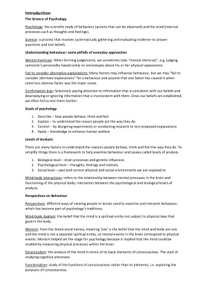 Covers 13 weeks of lectures. Topics include: Introduction Research methods Sensation and perception Applying Psychological Science - Performance Psychology Genes, environment and behaviour Biological basis of behaviour Applying Psychological Science - Abnormal and Forensic Psychology Learned Behaviours and emotions Cognitive processes - Memory and information processing Health and wellbeing Language and thinking Emotion and motivation States of consciousness