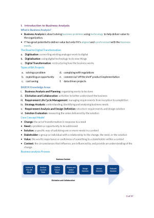 Detailed notes for all topics in the course. Includes the following topics: - Context analysis: PEST; SWOT - Planning and monitoring - Elication and collaboration - Requirement analysis and design definition - Requirements lifecycle management - Strategy analysis - BABOK perspectives and BPM - Requirements, design and evaluation - Agile solution delivery