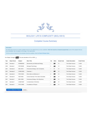 ✅ These notes summarise the ENTIRE EXAMINABLE CONTENT of BIOL10010, and can therefore be used as a substitute for the textbook (saving you time and money!!!) ✅ The following are included in these notes: ✅ A concise summary of all 36 lectures ✅ Summarised textbook readings that have been integrated with lecture content ✅ Annotations highlighting content that is guaranteed to come up on assessments ✅ Self-made revision questions (with answers) to test your understanding as you work through subject content ✅ Key words and terminology, making it Ctrl + F friendly for exams ;) Wishing you the best of luck for BIOL10010! 𝐌𝐨𝐝𝐮𝐥𝐞 𝟏: 𝐄𝐯𝐨𝐥𝐮𝐭𝐢𝐨𝐧 𝐚𝐧𝐝 𝐥𝐢𝐟𝐞'𝐬 𝐝𝐢𝐯𝐞𝐫𝐬𝐢𝐭𝐲 Lecture 1: Reproduction Lecture 2: Respiration Part 1 Lecture 3: Respiration Part 2 Lecture 4: Excretion Lecture 5: Movement Lecture 6: Fossils 𝐌𝐨𝐝𝐮𝐥𝐞 𝟐: 𝐖𝐡𝐚𝐭 𝐢𝐬 𝐞𝐯𝐨𝐥𝐮𝐭𝐢𝐨𝐧? Lecture 7: Evolution Lecture 8: Hardy Weinberg Theorem Lecture 9: Natural Selection Lecture 10: Genetic Drift and Gene Flow Lecture 11: Speciation Lecture 12: Molecular Genetics 𝐌𝐨𝐝𝐮𝐥𝐞 𝟑: 𝐒𝐞𝐧𝐬𝐢𝐧𝐠 𝐚𝐧𝐝 𝐫𝐞𝐬𝐩𝐨𝐧𝐝𝐢𝐧𝐠 𝐭𝐨 𝐭𝐡𝐞 𝐞𝐧𝐯𝐢𝐫𝐨𝐧𝐦𝐞𝐧𝐭 Lecture 13: Defining life 1 Lecture 14: Defining life 2 Lecture 15: Temperature Lecture 16: Signalling Part 1 Lecture 17: Signalling Part 2 Lecture 18: Reproduction and Information 𝐌𝐨𝐝𝐮𝐥𝐞 𝟒: 𝐃𝐲𝐧𝐚𝐦𝐢𝐜 𝐩𝐨𝐩𝐮𝐥𝐚𝐭𝐢𝐨𝐧𝐬 Lecture 19: Populations Lecture 20: Population Growth Models Lecture 21: Stochasticity and Dispersal Lecture 22: Life History Strategies Lecture 23: Population and Disease Lecture 24: Threatened Species 𝐌𝐨𝐝𝐮𝐥𝐞 𝟓: 𝐄𝐜𝐨𝐥𝐨𝐠𝐢𝐜𝐚𝐥 𝐜𝐨𝐦𝐦𝐮𝐧𝐢𝐭𝐢𝐞𝐬 Lecture 25: Introduction to Ecological Communities Part 1 Lecture 26: Introduction to Ecological Communities Part 2 Lecture 27: Interspecific Interactions Part 1 Lecture 28: Interspecific Interactions Part 2 Lecture 29: Dynamism of Ecological Communities Lecture 30: Conservation 𝐌𝐨𝐝𝐮𝐥𝐞 𝟔: 𝐄𝐜𝐨𝐬𝐲𝐬𝐭𝐞𝐦𝐬 𝐢𝐧 𝐭𝐡𝐞 𝐀𝐧𝐭𝐡𝐫𝐨𝐩𝐨𝐜𝐞𝐧𝐞 Lecture 31: The State of Nature Lecture 32: Environmental Cycles Lecture 33: Australia's Ecosystems Lecture 34: Conservation and Restoration Lecture 35: Indigenous Australian Land Management Lecture 36: Nature Based Solutions