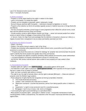 These are the notes that I used to receive a 86 in law 2112. I made these notes using the required readings, lectures, tutorials, lexis nexis study guides and various other textbooks on property law in the library. They contain a summary for all of the topics and are workable notes that can be used in exam conditions. Topic 1: Concepts of property Topic 2: Introduction to the fragmentation of proprietary interests Topic 3: An introduction to title to land Topic 4: An introduction to legal and equitable land Topic 5: Tenure and estates Topic 6: Possession, law of finders, adverse possession & part parcel claims Topic 7: Acquisition and transfer of proprietary interests' sale and gift of property Topic 8: Leasehold estates Topic 9: Creation of a leasehold interest Topic 10: The borderline between contract and property- contractual licences Topic 11: Leasehold covenants Topic 12: Regulation of leases Topic 13: Easements Topic 14: Restrictive covenants