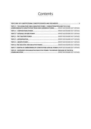 These notes cover Topics 1 to 8, and all relevant cases are cited; however, case summaries are in a different document. TOPIC ONE: KEY CONSTITUTIONAL CONCEPTS SOURCES AND DOCUMENTS TOPIC 2 – THE LEGISLATURE AND LEGISLATIVE POWER – CHARACTERISATION AND THE S 51(I) COMMONWEALTH CONSTITUTION TRADE AND COMMERCE POWER. TOPIC 3 – CORPORATIONS POWER TOPIC 4 – EXTERNAL AFFAIRS POWER TOPIC 5 - THE TAXATION POWER TOPIC 5 – APPROPRIATION TOPIC 5 – GRANTS POWER TOPIC 6: THE EXECUTIVE AND EXECUTIVE POWER TOPIC 7: CHAPTER III COMMONWEALTH CONSTITUTION JUDICIAL POWER TOPIC 8 – RESTRAINTS ON LEGISLATIVE/EXECUTIVE POWER: THE IMPLIED FREEDOM OF POLITICAL COMMUNICATION
