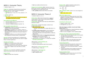 Summary sheet which contains step by step on how to solve commonly asked questions. - Notes contain both lecture slides and textbook - Good for exam revision (eg. shortcuts on how to approach questions) Weeks 1-12 notes: Topics covered include 1. Consumer Theory (Weeks 1-4) 2. Producer Theory (Weeks 5-6) 3. Monopoly (Week 7) 4. Pure Exchange Economy (Week 8) 5. General equilibrium (Week 9-10) 6. Insurance (Week 11-12)