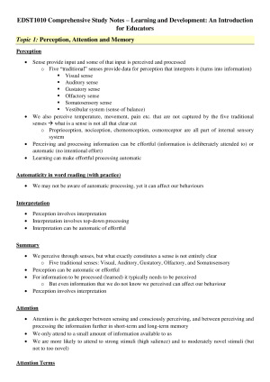 Comprehensive and detailed notes that incorporate all lecture and tutorial content. These notes are colour coded based on which topic it falls under and will be all you need to successfully pass your unit! Topics covered (all lectures is covered and definitions/terms are provided): *Week 3, week 5, week 7 - there were no lectures provided* - Perception, Attention and Memory - Effective Learning Strategies - Learning Theories - Language Development - Social Development - Social Development 2